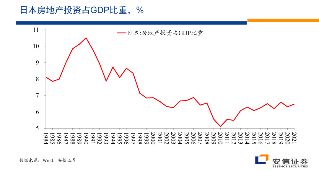 我们知道80年代的日本,2000年的美国都已经是一个人均收入很高度发达的经济体,也是早已经完成城市化的经济体。但是在那个条件下,我们看到他们房地产投资占整个GDP的比重还在接近8%的水平,这里的房地产有住宅,也有商业地产等等。