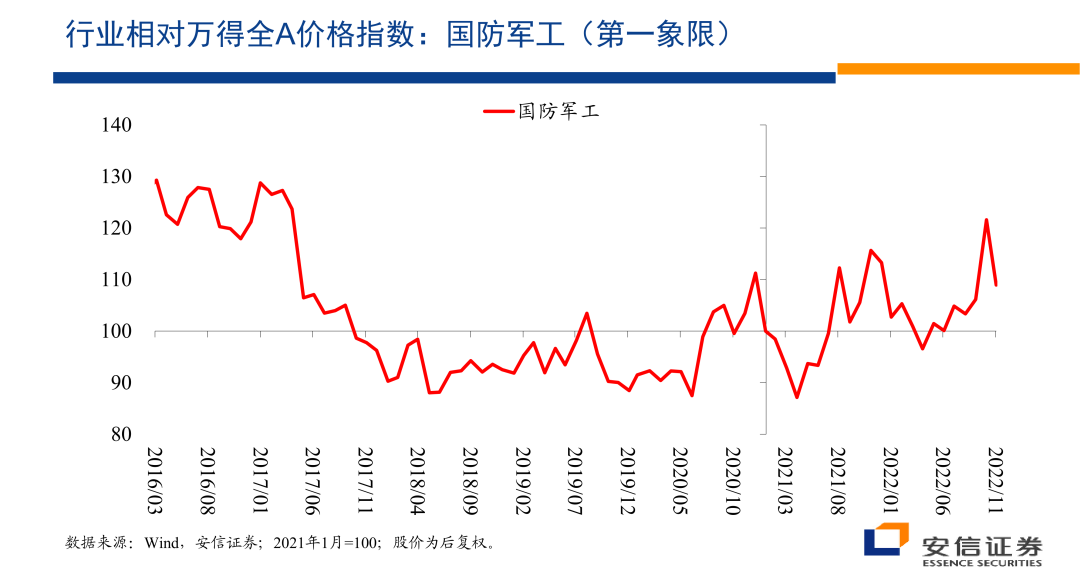 我们这张图的话使用的是国防军工相对于万德全A的价格指数,就是国防军工的价格指数除以万得全A的价格指数,然后某个时间点设定为100,然后我们来看它的变化。那么在这张图上很容易看到的,2020年的某个时候以来,相对于万得全A指数,总体上来讲,国防军工指数开始获得一个单边的,尽管有很多波动的越来越大的一个相对收益。