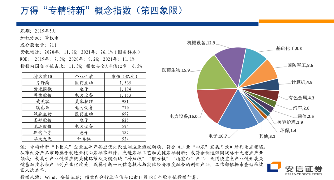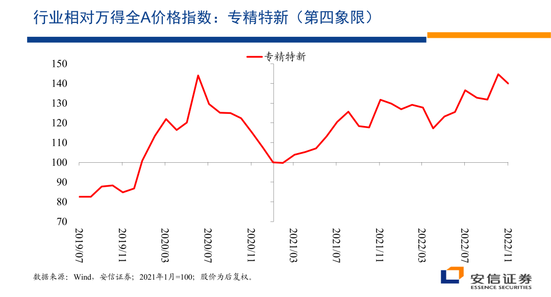 最后我们看一个专精特性,开一个专精特新,是因为我们一开始提到的,在涉及到安全关切的众多的小的细分领域,由于技术上的不确定性,以及这些领域足够的细分,完全由国有企业去主导这些领域,我个人认为可能在操作上不一定那么现实,国有企业也许就是起到主要的骨骼架构的作用,在大量的细分行业里边的龙头,可能主要还有民营企业来主导,那么围绕专精特新的这个板块的话,我们也来看一看它的一个表现和市场的看法。
