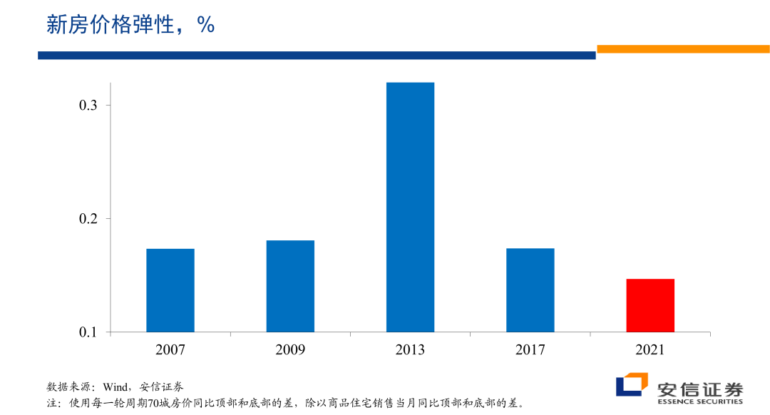但是从弹性的角度来看,在2021年以来的这一轮房地产市场调整过程之中,它的弹性是过去15年之中最小的。现在的弹性比2017年小,比2009年小,比2007年内容的话也要更小。在价格层面上更小的弹性,我们认为也支持这种看法,就是市场上的供应过剩的压力,至少在新房市场上并不可能显著,市场上没有显著的供应过剩的压力,显示它与一般的房地产泡沫破灭相比,具有一些显著不一样的特征。