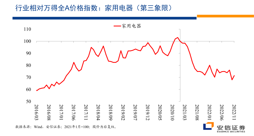 那么这个的话是第三是家用电器相对万得圈一指数的一个相对价格指数的情况,总体上17年以后有几年的增长,那么21年以后的话,在不长的时间里边把几年的增长吐得差不多了。