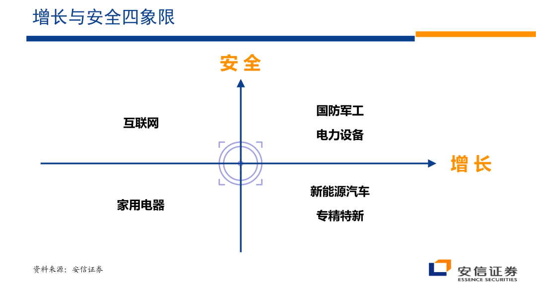 那么在安全与发展并重的条件下,它与过去效率优先追求增长的就具有显著的差异。那么为了分析这一体系的影响,我们就设了1个四个象限。那么在四象限的分析体系下,我们会发现对于一些行业它会产生非常大的影响,在一些领域国有企业会获得明显的估值优势。