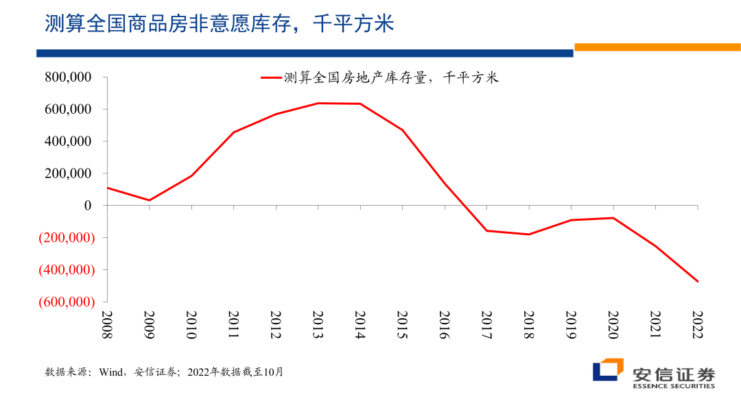 那么从这一估计结果来看,毫无疑问在13、14年前后,房地产行业曾经积累了大量的超额的存货,但是在2018年以后,这一存货水平基本上就已经下降到完全正常的水平。从这一估计来看,2021年和2022年房地产行业所持有的非意愿的存货放在历史上来看都处在异常低的水平,它的非意愿存货放在历史上来看,都处在非常低的水平。