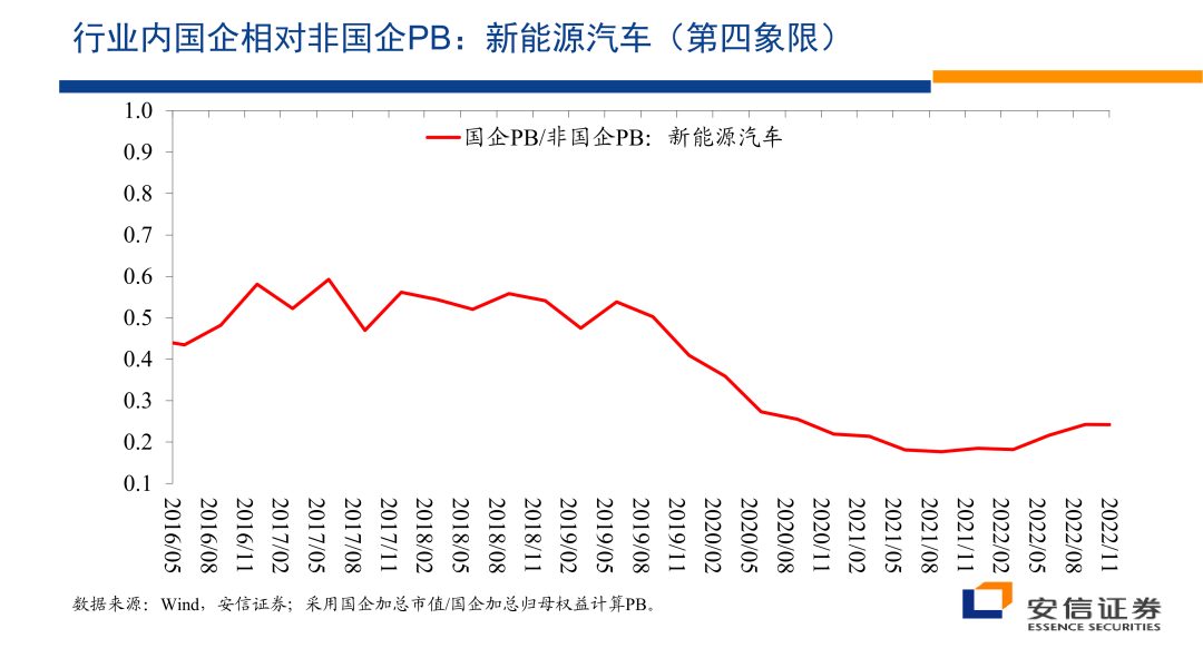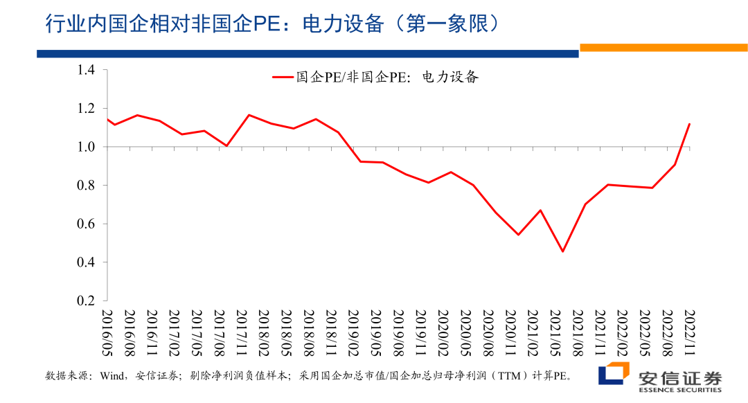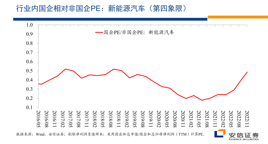 另外在行业之内,国企相对非国企在2020年以后它的估值优势在扩大。2020年以后,2021年初以后,国企相对非国企的估值优势在扩大,特别是在市净率层面上,估值的扩大的表现的很明显,在市盈率层面上情况是相似的。