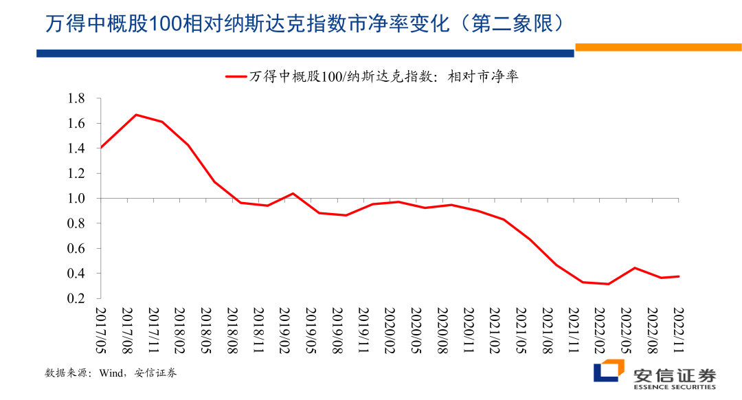 那么观察万的中概100指数的情况的话,毫无疑问的话就像大家都知道的一样,如果以纳斯达克指数为基准的话,我们看到进入2021年以后的话,它具有相对显著的价格上的走弱,同时的话他们的营业收入毫无疑问的话,特别是进入2022年以后的话,进入一个相对很低的增长阶段,这个的话是它相对纳斯达克的一个估值的变化,市净率的估值的变化。