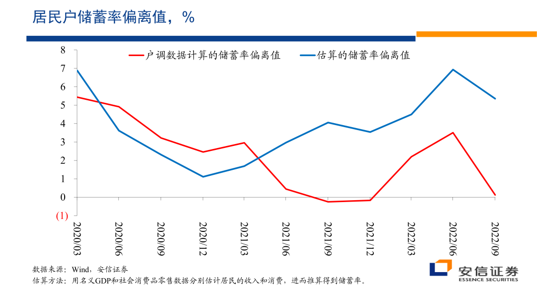 这样的上升一部分是因为部分的线下消费活动不可得,形成了被动的储蓄,另外一部分也可能来源于大家对未来收入的稳定性和可能性的信心下降,在这样的条件下,它需要有更多的储蓄。但是上面的蓝色的线是我们基于宏观的数据,基于宏观的国民收入,基于宏观的消费数据所反推出来的居民户部门的储蓄率。我们看到这两个数据有一定的差别,特别是在疫情以来,它们的走势的方向以及的水平应该说差别比较大,甚至是越来越大。