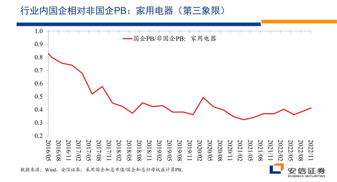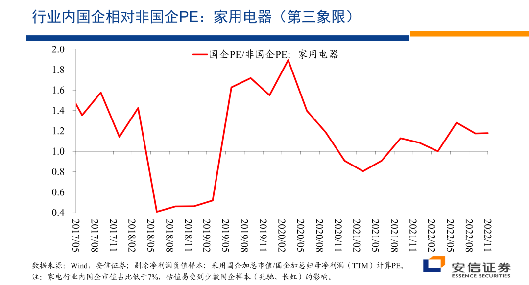 但是我们看这个行业内部国企相对非国企的估值层面的变化,总体上来看,尽管在国防军工领域,我们看到了国企的估值优势相对在扩大,但是在家用电器这个领域,国企相对非国企的相对估值体系总体上是相对比较稳定的。