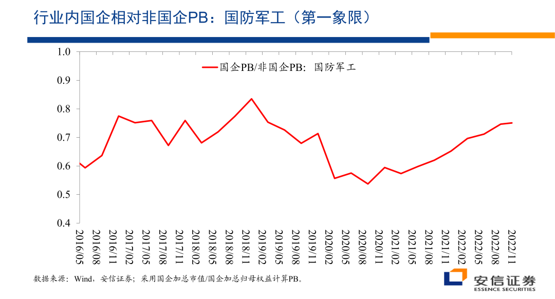 在第一象限里边的国防军工行业,如果大家说国防军工获得相对外的权益,获得一个相对的收益,可能还有很多别的原因。但是在行业内部国企相对非国企获得了估值上的优势,提供了另外一个值得我们思考的证据,那么这个的话是从市净率的角度来考虑,从市净率的角度来考虑,相对的结论也是类似的。