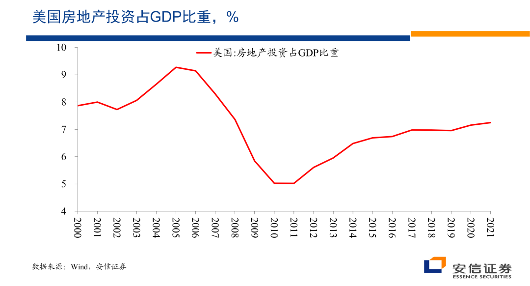 而1991年房地产泡沫破灭以后,日本的房地产投资就开始经历了一个长期的下跌过程。至于下跌过程的早期,可能主要反映的是对于过剩供应的消除过程,而这一投资占比下降的后期的变化,也许更多的与日本快速的老龄化存在更密切的联系,那么这是日本的数据。然后我们再来看美国的数据,美国的数据在一定程度上具有类似的特征,在2004年之前,美国房地产投资占整个GDP的比重差不多就在8%的水平。
