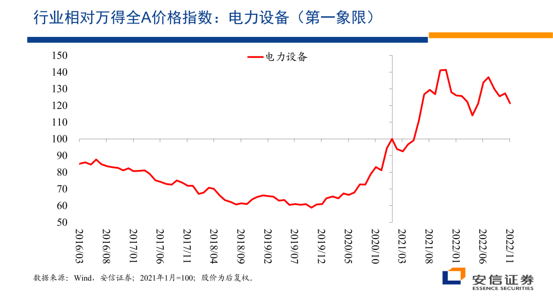 在这个意义上来讲,电力设备涉及到重要的基础设施,从而的话存在安全关切。但是到底如何看待电力设备这个行业,大家可以见仁见智,但是我们来看一看它的一个这个行业内的一个表现,一个的话是它相对万德全A的价格指数,我们看到进入2020年以后,总体上它具有明显的相对的收益。