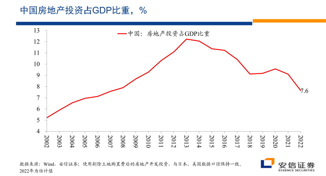 我们看到中国房地产投资占整个经济比重的最高点出现在2013年前,在当时这一比例大概在12%左右,从2014年以后,中国房地产投资占整个GDP的比重,总体上的话就开始经历一个单边的波动下降的过程,到2022年的这一比例估计可能在7.6%左右,7.6%左右的房地产投资占比与日本80年代早期泡沫化之前的水平,与美国2003年之前的水平基本上是接近的,也许略低一些基本上是接近的,考虑到中国的城市化过程还不能说已经结束,考虑到中国的人均收入水平还处在一个相对较快的提升过程之中,城市化过程也还不能说完全已经结束,我们很难认为这样的房地产投资的占比和水平处在明显偏高的状态。