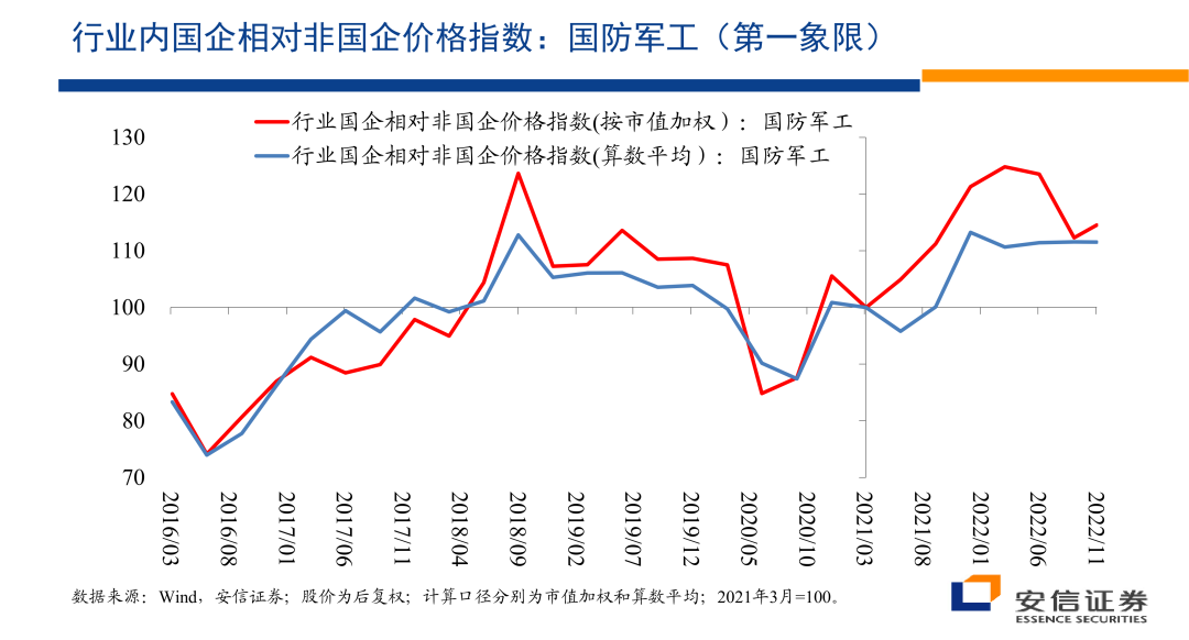 那么对国防军工这样一个明显的处于在第一象限的行业来讲,第一它高增长或者是高增长再进一步得到加强。另外一方面国企在获得相对的优势,那么至少在估值和相对收益层面上,市场的价格变化有这样的一些概念性的分析体系之中的判断,存在一定的一致性。那么这个的话是一个行业内的价格指数,应该说国企相对非国企的收益上的优势也是清楚的。