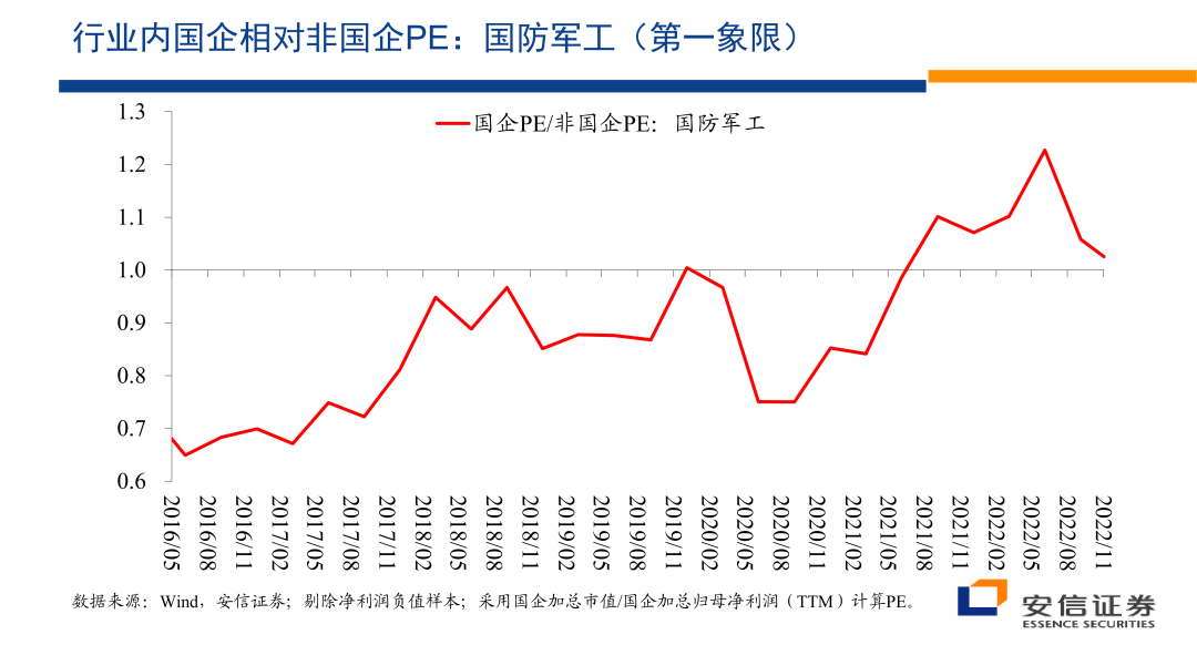 我们在这里的话也来看一看,就对于国防军工而言的话,它们的估值在行业内相对非国有企业的情况,那么结论也是类似的,跟我们刚才的阐述和预期比较接近。