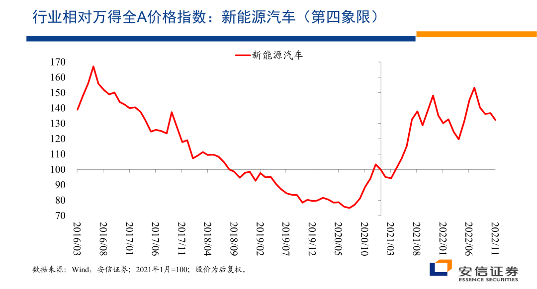 那么毫无疑问,我们知道新能源汽车是一个高增长的行业,进入2020年晚些时候以后,相对万德全A总体上来讲它获得了明显的相对收益。与此同时,在PE层面上,新能源、汽车在2022年5月就是在最近半年以来似乎获得了一些估值的优势,但是在PB层面上这种估值优势是很不明显的。