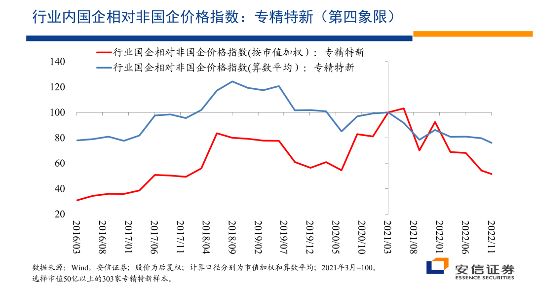 首先的话就是专精特新的相对的价格指数,总体上来讲的话,在2021年以来,2020年底以来,相对于万德全A的它有一个不断扩大的相对的收益。而且在专精特性内部,国企相对非国企的优势,