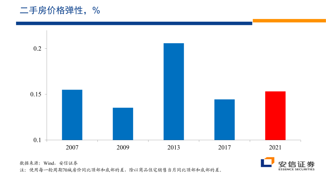 我们可以继续计算在二手房市场上的价格弹性,那么相对比较一样的特征是2013年在新房市场上有巨大的价格压力,价格弹性很大,在二手房市场上,2013年的时候,价格压力也很大,价格弹性也很大。