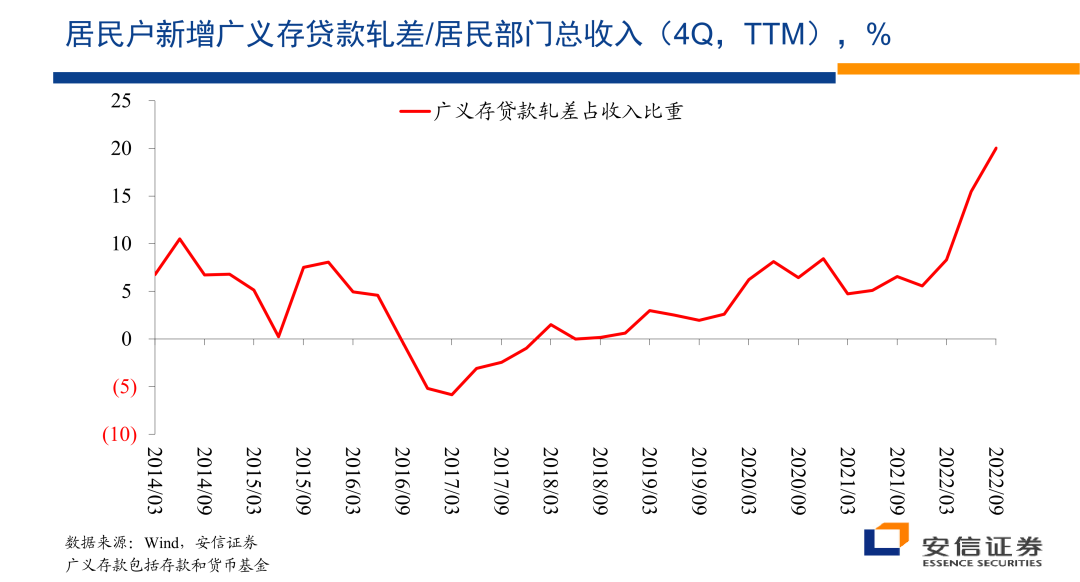 那么考虑到居民户买房等等以及经营的需要,以这样的收入流为支撑的,居民户的话还会从银行获取一些贷款,从而形成它资产负债表的变化在金融科目上。所以我们在分母上计算的是居民户的存贷款的轧差项,在它的存款科目上包括了它的储蓄存款,也包括了购买的货币基金,然后再扣减掉居民户出于购买房地产以及经营需要的话所获得的贷款。