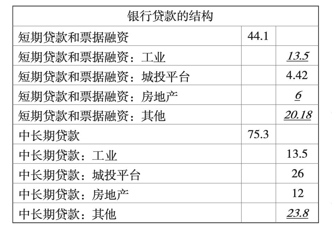 (4)根据万德(wind)数据库上的城投平台公司财务数据,截至2021年底,城投平台公司的银行贷款规模共30.4万亿元,其中长期借款为26万亿元,短期贷款为4.42万亿元。需要注意的是,万德上的城投公司显然没有涵盖所有城投平台,因此直接替代会低估城投平台在银行贷款中的比例,进而高估其他部门的贷款比例。