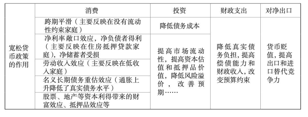 货币政策主要通过改变价格信号(利率),改善私人部门面临的跨期资金价格和资产负债表,支持其增加支出,同时也会通过增加税收和减少真实债务负担带动公共部门的资产负债表改善。