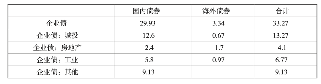 截至2021年底,企业债券合计33.3万亿元,其中国内企业债30万亿元,海外企业债3.3万亿元。分行业看,城投、房地产、工业企业和其他企业的国内债券分别为12.6万亿元、2.4万亿元、5.8万亿元和9.1万亿元。海外债券方面,截至2021年底,内地房企海外人民币和港币债券余额约1200亿元,美元债余额为2327亿美元,按照6.5:1的美元兑人民币汇率折算,为15125亿元,合计约1.7万亿元。同样的方法可计算出地方投融资平台海外债券规模折算成人民币约6700亿元,产业企业海外债券约9700亿元。