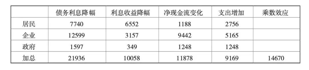结合中国的情况看,降低政策利率100个基点带来融资端利率和存款收益利率的不对称下降,居民、企业和政府净现金流分别增加1188亿元、9442亿元和1248亿元,考虑到不同群体的边际支出倾向和乘数作用以后会增加总收入14670亿元,拉动1.2个百分点的名义GDP增速。