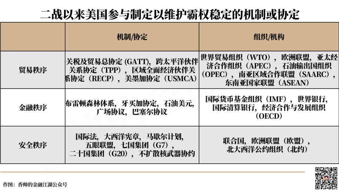 二战后,美国热心于维持全球秩序,并从秩序中获得巨大回报。同时,良好的全球秩序也促进了美国经济的平稳发展——这其实就是德尔伯格和吉尔平笔下“霸权稳定论”的核心。