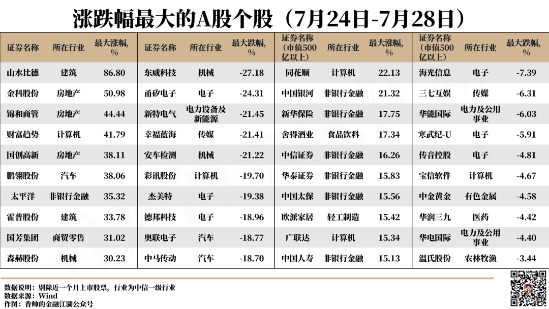 山水比德、金科股份和锦和商管上周换手率异常提高,主要原因在于房地产板块行情的带动以及散户投机情绪所致。消息面上,7月24日,中共中央政治局召开会议,指出要切实防范化解重点领域风险,适应我国房地产市场供求关系发生重大变化的新形势,适时调整优化房地产政策,因城施策用好政策工具箱,更好满足居民刚性和改善性住房需求,促进房地产市场平稳健康发展。