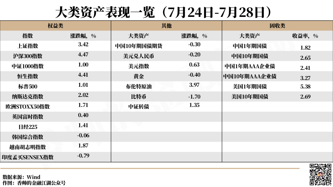 上周持有什么资产能够大赚呢?上周大类资产中表现最好的是沪深300指数,周内上涨4.47%。7月24日,中共中央政治局召开会议,会议对经济的判断相比4月更加谨慎,从“经济增长好于预期”,到目前表述改为,“经济恢复是一个波浪式发展、曲折式前进的过程”。后续一系列逆周期政策有望积极部署,极大提振了市场信心。