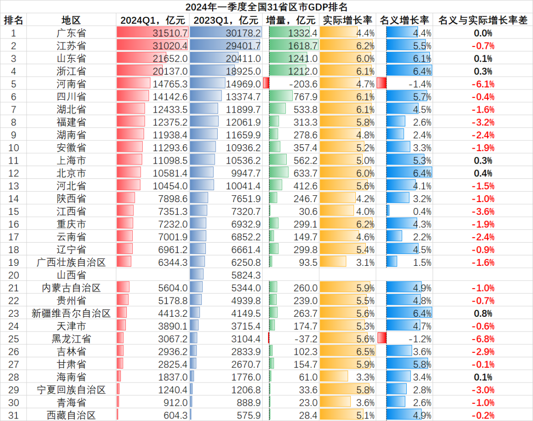 早上醒来已经在放假状态。懒洋洋刷手机,看到一张图表一个消息,忍不住陷入了沉思。图表上是一季度各省GDP的数据,包括了实际增长和名义增长,实际增长率 = 名义增长率 - 通胀(一般就是CPI)。所以这个表缺了一列,就是各个省的通胀。我们把后面两列做个简单减法,就会得到这组通胀数据。我在原表上加了一列,补充完整了——