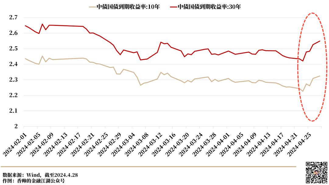 可以观察到:2024年1季度,全国31个省市的平均CPI是-1.5%,其中23个省的CPI为负数,河南和黑龙江甚至都超过-6%。换句话说,这些省应该都是比较严重的负通胀(如果不叫“通缩”的话)。通缩意味着什么?来个见文生义版本:通,通货,也就是钱;缩,缩水,紧缩。一般经济过热容易通胀,经济过冷甚至衰退就通缩。所以,和通胀“钱毛了”相对应,通缩就是“钱瘪了”,所以最近大家都觉得穷了,确实如此,因为钱缩水了。一般的宏观经济学告诉我们,降息,发钱,刺激经济,可以对抗通缩。从凯恩斯至今,100年的宏观调控历史,类似例子比较多,成功的也多。包括中国。但我还读到一则消息——“4月29日,财政部30年期国债“23附息国债23(续6)”加权中标收益率为2.6083%,全场倍数2.83,边际倍数2.25。中债国债到期收益率数据显示,4月26日,30年期国债到期收益率为2.5257%”。一般来说,国债收益率大体上可以看做长期利率的锚点。稍微看了一下。