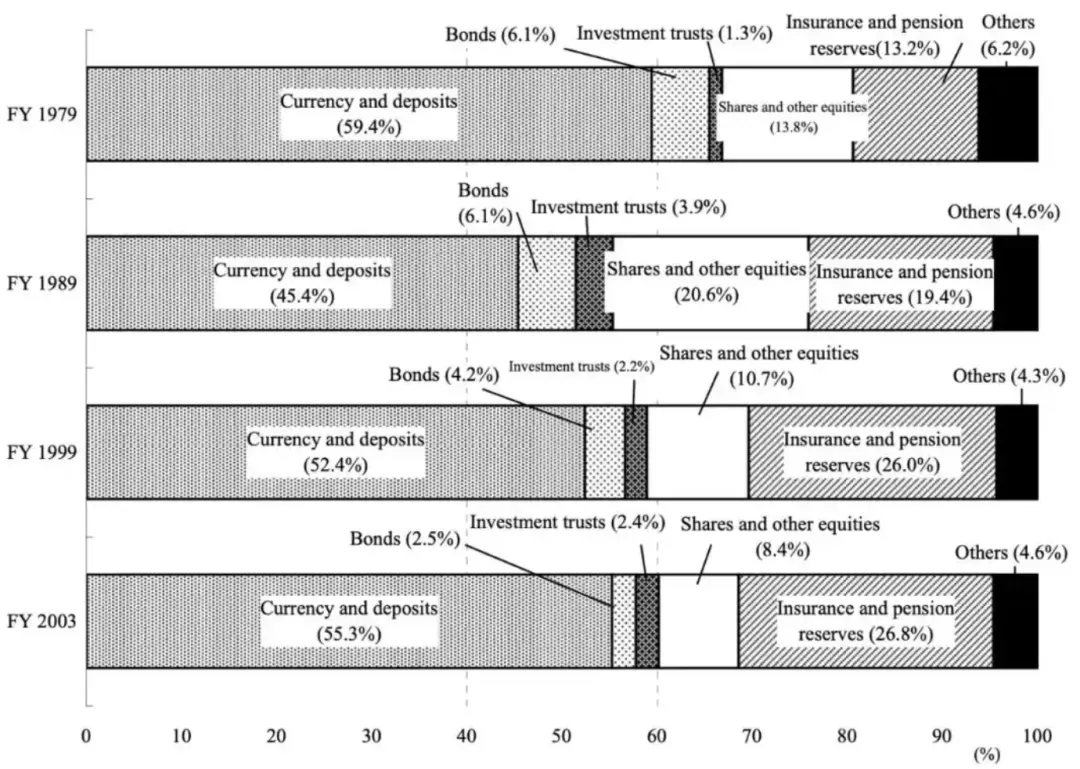 可居民也不傻。存款搬家的前提,是风险资产得赚钱。谁会往亏钱的资产上配置呢?日本就是最好的例子。90年代地产和股市开始下行后,在跌多涨少(1990-1993年四年连跌,1996年暴跌超50%,1998年再跌20%)以及持续通缩的双重打击下,日本家庭坚守“现金为王”,现金和存款占比从45%飙升至55.3%,股票配置则从20.6%腰斩至8.4%。