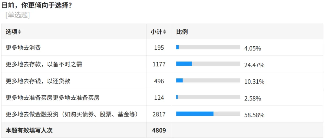 我们近期财富配置能力测试的结果,同样显示剧烈的变化。4809位参与者的选择中:58.6%的人表示想进行金融投资。而在去年同样的调查中,存款以51%的得票率高居榜首,金融投资仅占21.1%。短短一年,天平完全倾斜。这种态度的急剧转变,不仅仅是市场行情带来的短期情绪,更深层次地反映了市场环境和投资者资产配置需求的共同转变。