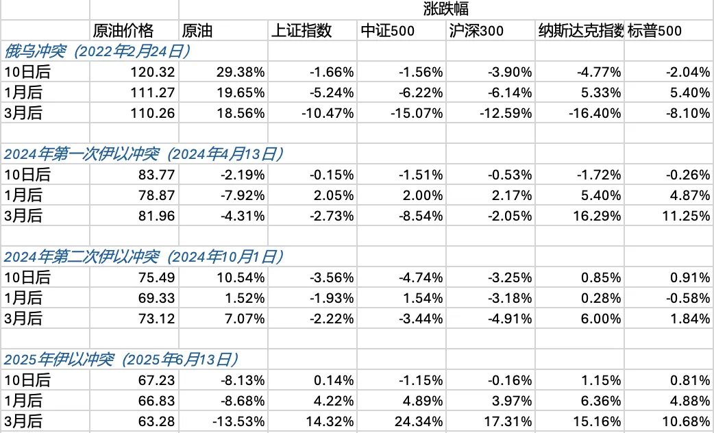 俄乌战争是近年来,唯一油价在3个月后仍维持近20%涨幅的一次事件,同期A股主要指数跌幅均超10%。反观几次伊以冲突,油价波动温和,A股中期走势更多由国内因素驱动——2025年伊以冲突后3个月,上证指数甚至涨超14%。