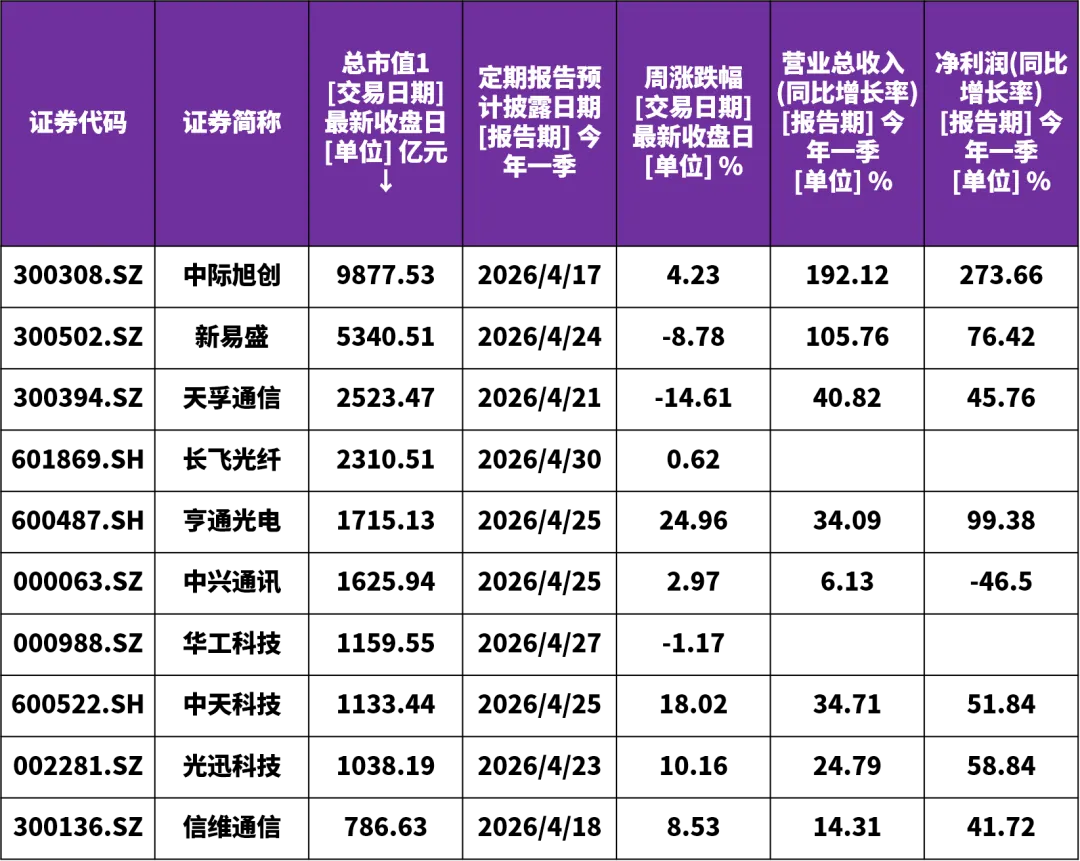 但真正拥抱了抱团板块,做了持股,体验却不会太好。最能说明问题的就是上周四、周五的光模块。中际旭创一季报营收194.96亿(+192%)、净利57.35亿(+262%)——单季利润直接超过2024全年——周线还能涨4.23%;新易盛一季报也不差,营收83.4亿(+106%)、净利27.8亿(+77%),但市场预期是32–38亿净利,差了一截,周线-8.78%。同一个赛道,同一周财报,一个上天一个入地。天孚通信稍早公布,周跌幅干到-14.6%。